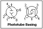 The basing for phototubes is shown at the right. These connections apply to nearly all phototubes with octal and small 4-pin bases, including the 1P40/930 gas and the 1P39/929 vacuum phototubes that are typical. If there is a cap, it should be obvious whether it is connected to the anode or cathode. The corresponding pin is then unused. The arrow shows the direction of incidence of light. The photocathodes for these tubes have a projected area 5/8" wide x 13/16" high, centered 1-5/8" above the seat of the base. The 1P39/929 has an S-4 cathode with maximum sensitivity at 400 nm, and is designed for photometry. The maximum anode voltage is 250V, the maximum photocurrent 5 μA, the maximum ambient temperature 75°C. The absolute sensitivity is 0.045 μA/μW at maximum, or 45 μA/lm for 2870K tungsten light. The dark current is 12.5 nA. The 1P40/930 has an S-1 cathode with maximum sensitivity at 800 nm, and is designed for sound reproduction and relays. The maximum anode voltage is 90V, the maximum photocurrent 3 μA (6 μA for anode voltages less than 70V), the maximum ambient temperature 100°C. The absolute sensitivity is 0.012 μA/μW at maximum, or 135 μA/lm at DC, 111 μA/lm at 5 kHz, and 101 μA/lm at 10 kHz. The maximum gas amplification factor is 10, and the dark current 100 nA. The voltages and specifications are quite typical of all gas and vacuum phototubes.