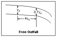 If, instead of a dam, we simply made a free outfall at the end of the channel, we would again get critical depth in the vicinity. Because of the curvature of the streamlines at the lip of the outfall, the point of critical depth is moved upstream by 3 to 10 times yc. The actual depth at the lip is about 0.72 yc. Now the depths are less than the normal depth, and the depth approaches the normal depth from below as we move upstream, instead of from above, as in a backwater. The water surface is now called a drop-down curve, and can be calculated in exactly the same way as a backwater curve.