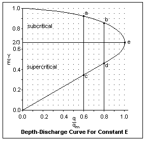 Note that the curve is plotted with respect to dimensionless variables, so the same curve can be used for any E or qm. Consider flows described by points a and c. Since they are on the same vertical line, the discharge is the same for each. The distance from the y = 0 axis to point a corresponds to the static part of E, while the distance from a to the y = E line corresponds to the kinetic energy, which sum to E. The same holds for point c, but here the static part is much smaller and the dynamic part larger. At the point of maximum discharge for this value of E, point e, the static energy is twice the dynamic energy.