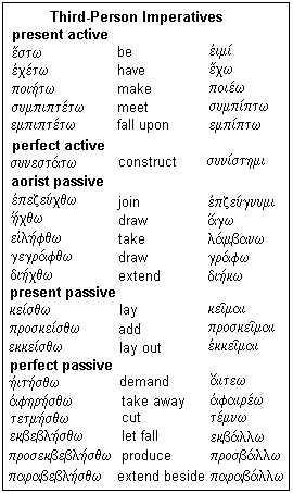 Imperatives found in Book I of Euclid are shown in the box on the right. The verb from which each is derived is shown, together with a hint of the meaning. The actual meanings will be clear when you encounter them in the text. As you can see, most are passive, but a few active imperatives also are there. Present, aorist and perfect tenses are all represented. In the present and perfect tenses, the ending is -sqw, and in the aorist tense, the most-used, simply -qw. Note that θ is a sign of the passive. The active imperatives have a τ instead. For the plural, Euclid adds -san to the singular. This plural ending is typical of the koinh/, and differs from that shown in many grammars, which are older forms of what was quite rare anyway. The aorist tense refers to a single action finished and complete, and is the most common in Euclid. The present tense refers to some current action, as a step in the course of a proof, while the perfect refers to some prior action that has established the conditions for a following one. Here, the presence or lack of a σ distinguishes perfect from aorist. Actually, the aorist is usually better characterized by augment of the verb stem (lengthening of the initial vowel), and the perfect by reduplication. There are, of course, both strong and weak aorists to contend with. In cases of uncertainty, look up the principal parts of the verb. The sixth principal part is the aorist passive.