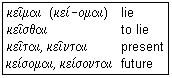 Note the elision of ι and the change of π to φ before rough breathing in e)f = e)pi. The verb kei~mai, to lie, is in the middle mood. The line acts on nothing, nor is acted upon, but the state of lying is something it does for itself, and this is excellently expressed in Greek by the middle mood. Some forms of this verb are shown in the box. We have contraction again, and the circumflex is evidence for it. Note that the circumflex disappears in the future, where there is no contraction, and we see the full endings -otai and ontai. You now know how to recognize the present middle of any verb.