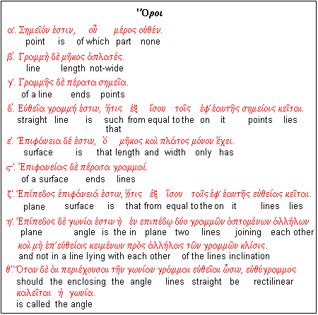 Book I begins with the fundamental definitions for geometry. Subsequent books give the additional definitions necessary for them. The Greek text will be shown in red, with suggestions of the meanings of the words beneath. Work out the cases of the nouns, and the tenses, moods, voices, person and number of the verbs. Most of the words have been already presented in previous lessons, to which recourse should be made for further information. Additional explanations will be given here. Let us begin with the first nine definitions.