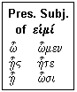 A kli/sij, -ewj is an inclination, and a/)ptw means to join or fasten. The conjunction o/(tan requires the subjunctive. The present subjunctive of ei/)mi is shown in the box. You should be getting used to the ν-movable by now, and we will not mention it further. The verb perie/cw combines the preposition pe/ri with the familiar verb e/cw: around + have = to surround or encompass. Be on the lookout for this kind of word-building in Greek; it is much used.