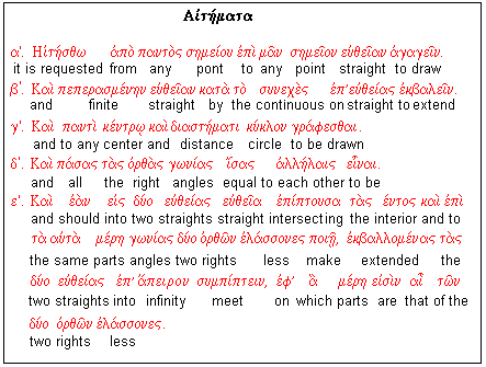 The fifth postulate is quite different from the others. The reason why Euclid stated it in this form can be seen when we come to the proposition in which it is used, to prove that if two lines are parallel, then the sum of the interior angles is two right angles. The converse is easily proved by contradiction, and, in fact, Euclid does this first. But now, if we have two parallel lines by hypothesis, we cannot suppose that they meet and prove a contradiction, because parallel lines never meet, by definition. Hence, the need for this postulate. There are other ways out of this difficulty, but none as clear and straightforward as Euclid's. The e)a/n calls for the subjunctive, which is the poi/h. There is a present active participle, e)pi/ptousa. The ε is not an augment, but part of the verb stem. E)la/sswn is spelled with -σσ- instead of -ττ- here. Analyze this sentence until you can put the words together in good English.