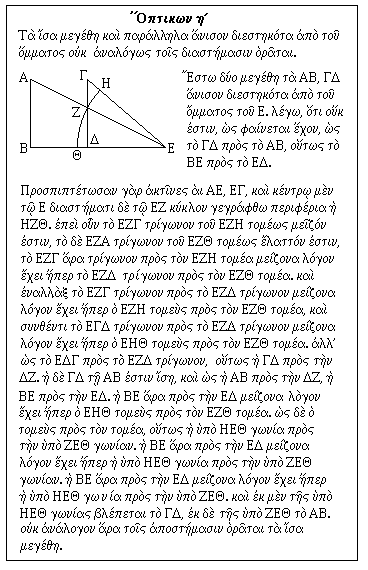 To proceed: "Let the two magnitudes AB, ΓΔ [be] unequally distant from the eye E. I say, that it is not, as it would seem, that ΓΔ is to AB, as BE is to EΔ. Let the rays AE, EΓ be projected, and let be drawn the arc HZΘ with the center E and radius [distance] EZ. Therefore, since the triangle EZΓ is greater than the sector EZH, and the EZΔ triangle is less than the sector EZΘ, therefore the EZΓ triangle has a greater ratio to the EZH sector than even the EZΔ triangle to the EZΘ sector. And invertendo the EZ&GAmma; triangle has a greater ratio to the EZΔ triangle than even the EZH sector to the EZΘ sector, and componendo, the EΓΔ triangle has a greater ratio to the EZΔ triangle than even the EHΘ sector to the EZΘ sector. But as the EΔΓ [is] to the EZΔ triangle, so [is] ΓΔ to ΔZ. And ΓΔ is equal to AB, and as AB is to ΔZ, BE [is] to EΔ. Therefore, BE has a greater ratio to EΔ than even the EHΘ sector to the EZΘ sector. And as the sector is to the sector, , so the angle HEΘ is to the angle ZEΘ.Therefore, BE has a greater ratio to EΔ than even the angle HEΘ to the [angle] ZEΘ. And ΓΔ is seen under the angle HEΘ and AB under ZEΘ. Therefore, the equal magnitudes are not seen proportionally to the distances." Is that clear?
