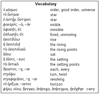 Since we are dealing with a new subject, astronomy, we will find a different vocabulary. The words needed for Proposition III are listed in the box at the left. The word ko/smos comes from the verb kosme/w, "order" or "arrange." It has received the figurative meaning of "universe" or even "mankind" as expressing the ordered reality of experience. There are two common words for star, one masculine and one neuter; the neuter is used in the Proposition. Both words include what we call the planets, from pla/nhs, "wanderer," but not the sun and moon. The stars proper are the fixed stars, and the adjective uses the α-privative. Stars may be visible, when above the horizon, and invisible, when below. Because of the diurnal motion, stars rise and set, and here are the words for these phenomena. Anatolia was the land of the rising sun, the East with respect to Constantinople. The horizon is the "cutting" or "division", from the verb o(ri/zw, "divide" and ideally seen in the line dividing sea and sky. The middle and passive of the verb stre/fw is used for "revolving" as in the motion of the celestial sphere; we find the participle in the Proposition. To strengthen this sense, we may use the middle of the verb fe/rw, which curiously has the same sound as the Latin fero, which means the same thing. All six principal parts of this verb are given, since this is one of the terrible examples of irregular stem formation (as it is in Latin). Several different verbs have been conflated here into a single verb. As a review, the principal parts are: present, future, aorist, perfect, perfect middle, aorist passive, in the first person singular, and give all the stem forms used to conjugate the verb.