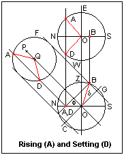 It greatly aids understanding to make your own drawing. The first thing is to draw the circles representing the horizon and meridian in the same positions as shown in the Figure. Now draw the line OP at the angle of the latitude, the equator CG perpendicular to it, and lay off the angle δ that is the declination of your chosen star. It is good to do this for a star you know, and for your actual latitude. Now draw BA through B parallel to the equator. From its intersection A with the horizon, draw a line perpendicularly upward crossing the horizon in the plan view, and determining the points of rising, A, and of setting, D. This solves the problem, and the angles of A and D from North can be read off using a protractor. With a level horizon, this is where your star will rise and set. If you know the right ascension of your star, and the sidereal time on the day (which locates the vernal equinox), it is easy to find the times of rising and setting as well.