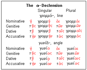 The declension of feminine nouns whose stem ends in long α is shown in the Figure. Unless the stem ends in ια or ρα, the α changes to η in the singular, as it does in the definite article. The long α in the stem of grammh/ changes to η in the singular by the rule given here. Note the close analogies with the o-declension. The genitive plural of feminine nouns is always accented on the ultima. There are also nouns with a short α, where the α does not change to η in the singular even though ι or ρ do not precede it. They are declined as the example shown. An example is qa/latta, "sea."