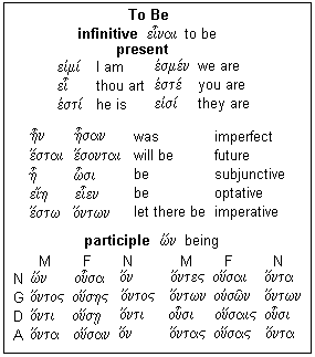 ei~)mi is one of the few really irregular verbs in Greek; it is not a typical -μι verb. It does not describe an action (a verb if often carelessly defined as a word expressing an action), but a state, or link between two notions. Of course, it cannot have a middle or passive voice, but expresses all the moods. It has only present, imperfect and future tenses. In the figure, the complete present tense is shown, but we will only need the third person, so that alone is given in the other tenses. It has smooth breathing throughout. Accents and breathing distinguish it from words that are spelled the same. The present and imperative forms are found in most propositions; the other forms are rarer.