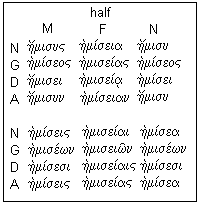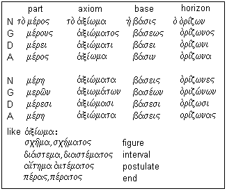 Here are some additional declensions of words we will find in Euclid that have differences from those already studied. Note the similarities in the endings. You will find it much easier to recognize a case than to construct one yourself. As always, the definite article is usually there to help you.