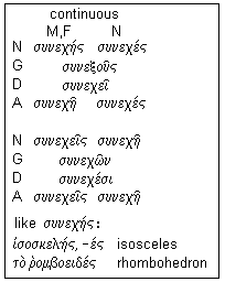 At the right is shown a adjective that uses the α-declension endings for the feminine, but consonant declension endings for masculine and neuter. There is no contraction in the neuter plural, and υs appear strangely in the singular. Nevertheless, there are several important adjectives of this type.