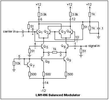 There are inverting and noninverting inputs for both carrier and signal, which can be fed differentially or single-ended. The single-ended feed is more convenient here. The carrier is put into the + carrier input through an 0.1 coupling capacitor, while the signal can be supplied directly to the + signal input, if it swings about ground, perhaps with a small DC component. When the circuit is properly arranged, the voltage at pins 6 and 12 should be about 8 V. The output can be taken from these pins, again either differentially or single-ended. The LM1496 can stand input voltages of up to 5 V, and the inputs should not be more than 5 V apart (to avoid breaking down the emitter junctions).