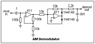 A linear detector is simply a rectifier. It has no gain, but also no distortion. An example is easily made from two op-amps, as shown in the circuit on the right. The second op-amp is a precision half-wave rectifier (the second diode is to "catch" the op-amp on the other half-cycle and prevent it from saturating). Note that it eliminates the diode drop. The high frequency ripple is easily seen in the output, but the output does reproduce the modulating signal. Look at what happens for an overmodulated signal, and if you have an amplifier and loudspeaker, listen to it as well.