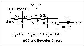 Another interesting circuit in the receiver is the AGC, or automatic gain control, shown at the right (also called AVC, automatic volume control). This is feedback tending to keep the level of the signal at the 2nd IF amplifier constant, independently of the strength of the signal, and is done by rectifying the signal and using the resulting voltage to change the bias on the 1st IF amplifier, so that its gain changes. A larger IF signal should result in a lower base voltage, which reduces the collector current, and with it the gain. The AGC and the detector are combined in one circuit. The time constant of the AGC must be long enough that it does not follow modulation changes, while the audio filter must remove the 455 kHz IF, and not attenuate the modulation frequencies. The AGC time constant is roughly 10 μF times 3.3k, or 0.033 s, corresponding to 30 Hz. The time constant of the ripple filter is roughly 0.01 μF times 2.2k, or 22 μs, corresponding to 45 kHz. The audio fits nicely between 30 Hz and 45 kHz.