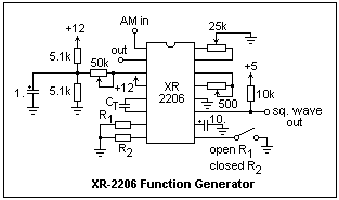 The XR-2206 provides a square wave at an open-collector output, as well as a sine wave. It can produce a triangle wave, but this is really just a step towards the sine wave, and is seldom required. The frequency is set by a capacitor, in the range 0.001 - 100 μF, and a timing resistor of no less than 1k, but preferably between 4k and 200k. There are actually two timing resistors, and which one is used is selected by the level on pin 9. When pin 9 is open or above 2 V, the resistor called R1 is used. When pin 9 is below 0.8 V, R2 is used. This gives easy frequency-shift keying (FSK) by a logic input to pin 9.