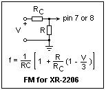 The output frequency can be modulated by an external voltage using the circuit shown at the right. R is the normal timing resisor, while RC handles the modulating current. The formula for the frequency is shown in the figure. If the applied voltage V is 3.00 V, the frequency is as determined by R. An increase in V lowers the frequency, and an increase raises it. Using R = 2.0k and RC = 1k, I could vary the output frequency from about 10 kHz down to 2 kHz by swinging V from about 1 V to 4 V. In any case, do not exceed 3 mA from pin 7 or 8. I was fairly close to the limit here, but RC = 2.0k for VC from 0 to 6 V would be OK. Use a buffered potentiometer to test the dependence of frequency on VC. Supply VC from a function generator, setting the DC bias at 3.0 V, and varying the amplitude over a small range, at a frequency of, say, 2 Hz, and watch the result on the scope. The waveform looks like a spring extending and contracting! Modulating the frequency with an external signal has quite a few applications. One is displaying frequency response on the scope--you might try this with a parallel resonant circuit. Feed Y and the XR-2206 with a triangle wave, and X by the rectified voltage across the tuned circuit. FM would also be good for testing a phase-locked loop.