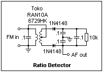 A circuit demonstrating ratio detection is shown at the left. It was simply rustled up from what I had available, and is not recommended as a practical demodulator. The transformer, in particular, seems ill-suited to the purpose, since the primary inductance was only about 0.8 μH, requiring a capacitor as large as 0.1 μF to resonate it at some frequency less than 1 MHz. If you can find a transformer with a higher primary inductance, your demodulator will probably work much better. Choose the capacitor so that the resonant frequency is around 500 kHz, which is convenient for us. The lead to the center tap of the secondary would have a blocking capacitor in it in a normal receiver circuit, since the primary would have a DC bias.