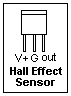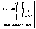 Several manufacturers make Hall Effect sensors in which a sensitive comparator detects the Hall voltage and provides a logic output. Considerable Schmitt trigger action is provided, so that the transition is sharp and does not chatter. In the DN6848 sensor, the H-L transition occurs at about 225 gauss, while the L-H transition occurs at about 5 gauss. The sensor is sensitive to only one direction of the magnetic field. Other sensors require a reversal of the magnetic field, from about 175 gauss in one direction to 175 gauss in the other. The output may have an internal pullup resistor, or may be open-collector. The DN6848 is open-collector, and a 27k pullup resistor is suggested. The power supply is 4.5 to 16 V, and may be different from the logic voltage pulling up the output. The pinout of the DN6848 is shown at the right; it is sensitive to a magnetic flux out of the page (south pole in front).