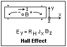 The Hall Effect has to do with a current I flowing in a conductor, say in the x-direction, in a region with a magnetic field B in the z-direction. An electric field E, called the Hall field, appears in the conductor in the y direction. These relations are shown in the diagram on the right. The + and - represent charge carriers of positive and negative charge, respectively, carrying current in the direction of I. Each is driven towards the lower edge of the conductor by the magnetic force at right angles to its velocity. To keep them moving straight, charges are necessary to establish an electric field in the y-direction to counterbalance the magnetic force, and these charges are shown by the small + and - symbols. Note that the direction of the field is different for different charges--positive for + charges, and negative for - charges. These relations work for any directions, not just the perpendicular ones considered here. However, this only introduces cosines and sines which complicate matters without adding anything new.