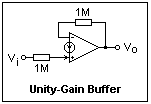 A unity-gain buffer is shown at the left. It looks like the same circuit for the usual op-amp, but here the resistors are necessary. The input resistor turns the applied voltage into a current, while the feedback resistor causes the output to rise to a value supplying an equal current to the inverting input. The circuit is not as precise as the usual one, with small shifts due to the diode drops at the input, but the circuit is useful and furnishes a reasonable input resistance of 1M. The extremely high input resistance of the voltage or FET-input op-amp is not obtained, however.