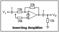 The first circuit to look at is the inverting amplifier, shown at the right. Note the symbol for the Norton op-amp, that has a current source between the inputs, and an arrow on the noninverting input. This is an AC amplifier, with coupling capacitors at input and output so there is no worry about DC bias levels, which can be chosen as necessary. The input and feedback resistors are as with the familiar circuit, and the gain in this case should be -2. The difference is the 39k resistor at the noninverting input. It supplies a current (12 - 0.55)/39 mA to this input, and the output endeavors to supply an equal current to the inverting input, which requires a DC output voltage of (20/39)(12 - 0.55) + 0.55 = 6.4 V, a convenient bias. The bias is set by the current I+, not by a voltage divider, as it would be with the usual op-amp. The LM3900 is very convenient for AC amplifiers. When you test this circuit, the scope traces for input and output can be superimposed with proper setting of the gain, and the inversion is obvious.