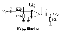 Another biasing scheme for the inverting amplifier is shown at the left. It relies on the diode drop at the inverting input to supply a current proportional to Vbe, which is then amplified by the feedback resistor. In this case, the bias is about 10 x 0.55 = 5.5V. Actual measurement gave 5.7 V. Here, the current supplied by the output is returned to the inverting input, where it flows out the 120k bias resistor, so the bias is positive. In this case, the bias does not depend on the supply voltage.