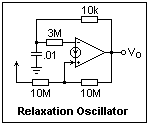 A relaxation oscillator is shown at the left. With the values shown, this circuit oscillated at 3840 Hz, the output swinging from near zero to 11.3 V. The slew rate of the LM3900 was evident in the output waveform. To understand this circuit, assume for simplicity that the output swings from 0 to the supply voltage V. When the output is 0, a current I+ = V/10 μA is supplied to the noninverting input. When the output is V, a larger current I+ = V/5 is supplied. These are the trip levels expressed in currents. When the capacitor is discharged, I- = 0, so the output is high, and the trip level is 3(V/5) = 0.6V. The capacitor charges until its voltage reaches this level, but then the ouput goes low and it begins to discharge again. The lower trip level is 3(V/10) = 0.3V. When the capacitor voltage reaches this level, the ouput again goes high, and the cycle repeats. For a 12V supply, these levels are about 7.2 and 3.6 volts. This is a very rough calculation, so we expect only general agreement. The measured values (from the scope) were 3.0 V and 8.4 V, and the capacitor voltage waveform was quite rounded on top and bottom--in fact, it would be a passable sine wave if you were not too particular. Buffered, this would be an easy way to get a sine wave.