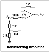 The unity-gain buffer is a special case of the noninverting amplifier, shown at the right with biasing by means of a voltage divider. The divider supplies a current into what is effectively a unity-gain buffer to reproduce its voltage at the output. This amplifier has a gain of +10, of course, or 20 dB. Again, the high input impedance of the voltage op-amp is not obtained.