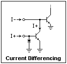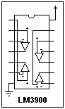 The LM3900 is a 14-pin DIP containing four identical op-amps, each with inverting and noninverting inputs and an output. However, these op-amps are very different from the usual op-amp, and must be used in a completely different way. The usual op-amp responds to a differential voltage at its inputs, but the LM3900 responds to a differential current. Instead of a differential amplifier, the input stage is the current-differencing circuit shown at the right. The current mirror at the noninverting input subtracts the current at that input, I+, from the current at the inverting input, I-, to form the difference current I- - I+ that is furnished to the amplifier with overall gain of 70 dB. If I- is greater than I+, the output saturates low, and if I- is less, the output saturates high. Feedback from the output to the inverting input acts to reduce the difference current, which in normal operation is very small. This is just like the usual op-amp, except with current instead of voltage. The output, however, is a voltage as with the usual op-amp. The label "Norton" refers to the Norton equivalent circuit for a current source.