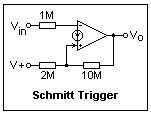 The relaxation oscillator makes use of a Schmitt trigger, with positive feedback. An inverting Schmitt trigger is shown at the right. The input and supply voltages can be exchanged to give a noninverting circuit. The output goes from high to low when the input reaches 7 V, and from low to high when it goes below 6 V, with a hysteresis of 1 V. The hysteresis can be displayed directly on the scope, using the X-Y display. Connect Ch 1 to the input voltage, and Ch 2 to the output. A 100 Hz triangle wave from a function generator makes a suitable input. Alternatively, use 0.5 Hz and watch the dot move. This is a very graphic illustration of Schmitt trigger operation.