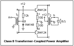 A transformer-coupled Class B push-pull amplifier is shown at the left. The input transformer T1 has a turns ratio 1:1.67, the output transformer T2 a ratio of 13:1, left side to right side. Note that the DC bias currents flow in opposite directions in the transformer windings, so they do not contribute any ampere-turns. The bias current is quite low in this amplifier anyway, only 0.4 mA. The 100Ω resistors in the emitter leads help to equalize the two transistors, but also sense the collector currents for us so we can look at them with the oscilloscope. The bases are biased with a 1N4148 diode that holds them one diode drop above ground, so the transistors are on the verge of conduction. A small resistor could be used here as well, but the diode provides some temperature compensation. Note the use of the center taps of the transformer windings. With transformer coupling at the input, the annoyance of keeping the bias divider impedance high is removed. Note that the bases receive the signal with opposite phases, just what is necessary to turn each of them on for a half cycle in alternation.