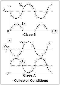 The way forward is to look for some way to reduce the bias current to zero. Then the amplifier would dissipate no energy just sitting waiting for a signal, and we could hope that more of the energy supplied would go into the output, not into heat and hot transistors or tubes. In a Class B amplifier, the collector current is zero for a half cycle. Conditions in the collector circuits of Class B and Class A amplifiers are shown at the right. If we use two transistors, alternately off and on, they can create a complete waveform, just as in a Class A amplifier. The beauty of this is that the bias current can be zero. Then, the average current taken from the power supply is just the average current in one loop of the signal input, 2/π times the peak value. Using the same notation as above, the power supplied is Vcc(2/π)I, while the signal amplitude is Vcc, and the signal power IVcc/2. The efficiency is then 78.5%, a nice, high value. If the signal amplitude is only Vcc/2, the efficiency is reduced to 39%. These figures are to be compared with 50% and 25%, respectively. The efficiency we have been talking about was usually called the plate efficiency, referring to the anode of the amplifying vacuum tube, analogous to the collector of a transistor.