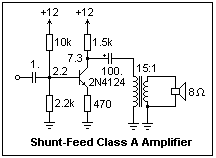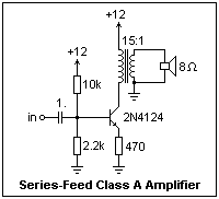 The circuit at the right shows a loudspeaker transformer coupled to a collector, at the same place a collector resistor would be expected. The transistor is biased by a voltage divider and emitter resistor feedback. The collector current is 3.2 mA, which puts the collector at 11.0 V (the transformer primary has a DC resistance of 310Ω), the base at 2.2 V, and the emitter at 1.5 V. The transformer has DC flowing in its primary, which could have a bad effect. We will find out on testing the circuit.