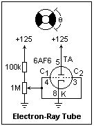 A very curious and ingenious kind of tube was the electron-ray tube, used on receivers to give a visual indication of the accuracy of tuning to a station. Don't confuse it with the cathode-ray tube that uses a guided electron beam for oscilloscopes and TV receivers. It showed a luminous disk, with a dark sector. The dark sector was made as small as possible to achieve accurate tuning. It worked from the AGC (automatic gain control) voltage of the receiver. This is a feedback signal that tries to keep the signal amplitude constant at the output of the intermediate frequency amplifiers, increasing the gain for weak signals and decreasing it for strong. It is usually a negative voltage produced by rectifying the IF output. The tube has a thermionic cathode and a conical anode or target covered with cathodoluminescent phosphor (like a CRT), which glows from the 3 or 4 mA of plate current that flows when it is across 125V or more (up to 250). Control electrodes, of which there are two on opposite sides of the 6AF6, make two dark sectors that are widest when at 0V, and narrow as the control voltage approaches the target voltage. The control voltage is typically provided by the plate of a triode controlled by the AVC, such that full negative AVC cuts off the triode and makes the sector as small as possible. All this was cheaper and more graphic than a pointer meter.
