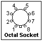 Vacuum tubes come with metal or glass envelopes, and in latter days with either the familiar octal arrangment of 8 pins, or as miniature glass tubes with 7 or 9 pins. There were earlier bases with four, five or six pins. Later, 12-pin miniature "compactron" or "duodecal" tubes were used in TV sets. Miniature tubes were not miniature, simply tubes with a button seal and all-glass envelope closely fitting a normal-sized cage. Subminiature tubes were actually miniature. Sometimes connections to grid, plate or (rarely) cathode were made to caps at the top of the tubes. In small tubes, these caps have a diameter of 1/4". The pins are numbered consectively clockwise, starting from the left of the index key for the octal, or to the left of the wider space, for the miniature, always looking at the bottom of the tube. This is shown for the octal base at the left. Pin numbers are given in the circuit schematics here. Most sockets have pin numbers marked. You will need to get sockets for the tubes you study, one for each type of socket. Solder wires to the tab at each pin that can be inserted in the solderless breadboard. I use the resistor color code for the pin numbers. A convenient octal socket fixture is available that comes with screw terminals for making connections. It was intended for relays, but is very useful for tube experiments. Heater connections for octal tubes are typically (not always!) to pins 2 and 7, and often to pins 3-4 on 7-pin, or 4-5 on 9-pin, miniature tubes. Sometimes halves of the heater can be connected in series or parallel, for two different voltages. Sockets were originally mounted in holes punched in aluminum chassis, secured by locking rings or by screws and nuts with a mounting plate. The chassis was, not surprisingly, the ground or common.