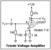 A resistance-coupled common-cathode amplifier is shown at the right, with load resistor and plate supply corresponding to our load line. The 1M resistance in the grid is the largest recommended value. If this resistor is too large, any positive ion current will produce a positive grid voltage (opposite to any electron grid current) and possibly lead to instability that will ruin the tube. The input impedance of the grid is very large, one of the advantages of the vacuum tube over the transistor. The cathode resistor of 1.5k sets the quiescent operating point roughly halfway between 0 and 124V, allowing the greatest possible plate voltage swing. Its value is easily found from the characteristic curves. I went for Vg = -2.0 V and Ip = 1.5 mA, giving 1.33k, but chose 1.5k as a nearby standard value. What I got was Vg = -2.1V at Ip = 1.4 mA, a satisfactory value.