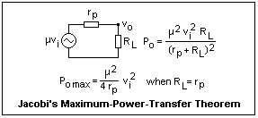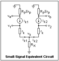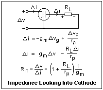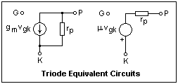 The small-signal equivalent circuits for the triode are shown at the right. The Norton source circuit is exactly the one for the FET. In the case of the triode, the plate resistance is always important, and cannot be neglected. The other circuit is just the Thévenin source corresponding to the Norton source. It shows the significance of the amplification factor, and is useful for triodes because of the rather small plate resistance. We did not find the Th%eacute;venin source for transistors very useful, and did not introduce a parameter analagous to the amplification factor for this reason.