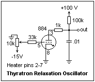 A relaxation oscillator circuit using an 884 thyratron is shown at the right. When the anode voltage was 101 V, and the grid voltage was -8.9 V, the circuit oscillated at 588 kHz, the capacitor voltage varying from 20 V to 86 V. Look at the capacitor voltage as a function of time while you vary the anode and grid voltages. There is an exponential charge to the firing voltage, then a very rapid discharge through the 1k resistor and the tube to extinction at 20 V. This signal could be used for a simple oscilloscope sweep circuit, and synchronized by a small positive pulse at the grid. The thyratron could also be used for phase control on an AC line, but the 884 cannot supply enough current for the usual applications. Larger mercury-vapor thyratrons were manufactured for this service that could handle several amperes.