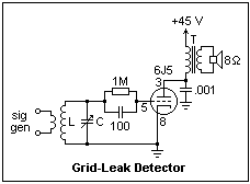 You may notice in the tube manuals that a "maximum grid resistance" is given for a tube; for the 6J5, it is 1M. The reason for this is positive ion current, which may drive the grid more positive in a resistance-coupled amplifier, disturbing the bias. This is not a maximum in the same sense as the maximum plate dissipation or maximum cathode current are, since damage to the tube is not in question. There is no trouble in the grid leak detector, and values of several megohms are permissible.