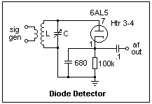 A diode detector, using a standalone diode, is shown at the left. The output is the same amplitude as the modulation on the carrier that is input, very closely, so the detector could not do any better. Often, the diode was included in the first AF amplifier tube, sharing the same cathode, and dual diodes were also available for full-wave detection, which doubles the output. If you have a tuned circuit at this point, it would be easy to test a diode detector, and high voltages are not required, just the heater power. A solid-state diode would work the same way, but the 0.7 V drop would make it less sensitive, and it would not even respond to weaker signals. Using a Ge diode (1N34A) would help, but not eliminate, the problem. The thermionic diode is ideal in this application.