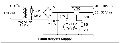 The circuit of the laboratory B+ supply that I use for vacuum tubes is shown at the right, and the supply itself is shown in the photograph below. It provides a regulated variable 60-150 V output, and a regulated fixed voltage output (for screen supply) created by a VR tube. VR tubes can be exchanged for different voltages. The MagneTek N-51X 115 V-115 V isolation transformer is available from Antique Electronics (see references), and a cheaper one from All Electronics. The transformer secondary has a DC resistance of 22Ω, which limits the surge current satisfactorily without having to add a series resistor. By no means eliminate the isolation transformer and use the 120 V household supply directly, because of the ground hazard. A variable transformer (Variac) is an autotransformer that does not isolate the output from the power line ground. I earnestly recommend that you do not work on AC circuits without isolating them from the service ground. The 110/220 adapters commonly available in 50W and 300W sizes, used for shavers and other small loads, should not be used, since they are autotransformers and do not provide isolation. They are, in fact, quite dangerous things, and should be used with great care. The supply was built in a 5" x 7" x 3" aluminum box, with an octal socket for the VR tube on top. The socket can be left vacant when the fixed voltage output is not required.
