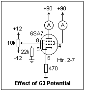 The circuit at the right can be used to study the partition of the cathode current between the plate and the screen grid. A 470 Ω resistor provides cathode bias, simulating oscillator action, but of course there is no oscillation here and the cathode current is constant. It was very convenient to measure the plate and screen currents with the ammeter functions of two DMM's, so that the plate and screen voltages would remain constant. The control grid G3 voltage is varied over a range of about 10V in all. The whole ±12 available is not needed; ±5 V would be sufficient. The cathode current in this circuit is 7.7 mA, and you will note that it remains practically constant as the control grid voltage is varied. This shows how well shielded G3 is from the oscillator. As the G3 voltage becomes more positive, the plate current decreases as more current goes to the screen. The conversion transconductance is the change in plate current divided by the change in G3 voltage. I found 315 μS, which can be compared to the published value of 425 μS. This is quite reasonable agreement. The pentagrid converter is a very interesting tube to study, since it is yet another example of a multiplier. We see that it is a pentode with a very peculiar screen grid.