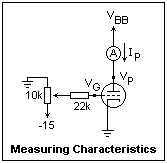 You will need a heater supply of 6.3 or 12.6 VAC (the "A" supply), a source of variable grid bias from 0 to -15 V (the "C" supply), and a variable plate supply of up to about 120V (the "B" supply). The variable grid bias can be created with a potentiometer, since there is no current load. I have found it convenient to take the plate supply from a voltage divider of 12 Zener diodes, giving 10 to 120 V in steps of 10 V, approximately. A tube socket to which connections can be made is necessary (such as an octal relay socket). For running characteristics, three DMM's are convenient. In cases of financial exigency, the grid bias can be set and assumed stable thereafter, and the voltage taps on the Zener divider can be assumed to have a constant value (actually the voltages don't vary by more than a volt or two anyway). Then only one DMM is necessary, to read the plate current.