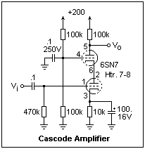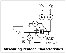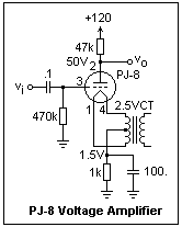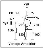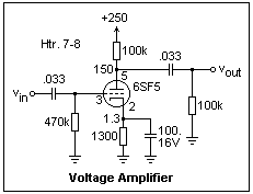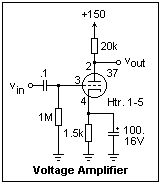 A pentode voltage amplifier with a gain of about -33 is shown at the right, using a 1U5, a sharp-cutoff pentode which comes in a 7-pin miniature package. Note the polarity of the filament supply, which is important, since it supplies a little grid bias as well. Since the voltages and currents are low, you can use the same 1/4W resistors used with transistors. The capacitors must have an appropriate voltage rating, of course. The 10M resistor is a "grid leak" that will prevent the grid from going positive. It charges on the positive excursions of the grid to provide whatever bias is necessary. The plate current was 61 μA, and the screen grid current was 20 μA. The screen grid potential is above the plate's in this circuit. Pentodes offer the capacity for controlling the plate current through the screen voltage, so that the plate voltage can be what is required. For higher voltages, the screen grid is normally at the same or lower potential as the plate, on the average. The grid voltage cannot be measured accurately with a DMM or scope, since the bias conditions will be disturbed. However, you will find that the amplifier works very well. Measure the gain the usual way, with a function generator and oscilloscope.