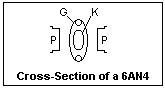 The 6AN4 is also very interesting to study. This compact tube is a high-mu triode, intended for high-frequency RF work, and comes in a 7-pin miniature envelope. It is unusual in that you can inspect all the works, seeing heater, cathode, grid and plate very clearly from the outside, since the plate is in two parts, which gives an unusual view inside. Use a magnifying lens to see the parts more clearly. A cross-section is sketched at the right. The grid supports are threaded rods, supporting the wire spiral of the grid close to the cathode. The heater is seen stuffed inside the cathode. When you apply heater power, the heater glows yellow and the cathode sleeve is orange. The electrons are in two streams, one stream directed to each of the separated halves of the plate, which are connected internally. The plate is brought out to two pins, 1 and 7, the grid to pins 2 and 6, and the cathode to pin 5. The dual connections make high-frequency circuits easier to construct physically. It is amazing that such a delicate example of advanced technology could be sold for a few dollars, about the cost of a hamburger.