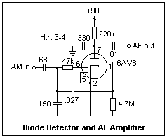A detector-amplifier circuit is shown at the left. This circuit is fed by a signal generator at AM in, and the audio output is taken from AF out. The amplifier uses grid-leak bias, which effectively clamps the peak of the audio wave at 0 V. The stronger the input signal, the more negative the grid bias, which makes the most of what is there. With an AM input of peak value 0.95 V and modulation amplitude 0.37 V, the peak to peak output was 3 V, for a gain of -8, which is quite good. I used a radio frequency of 2 MHz, and modulation of 1 kHz. At lower radio frequencies, the filtering of the output becomes progressively worse; this could be optimized if desired. This detector gives good fidelity with high sensitivity.