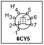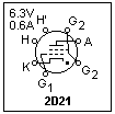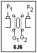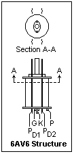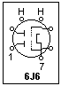 The 6J6 is also a very interesting tube. As with the 6AN4, the "works" can easily be seen. A cross-section of the 6J6 is shown at the right. There is a separate plate and grid on each side of the wide cathode, making two triodes that share a common cathode. The two triodes have an almost planar geometry, which is unusual. This tube was used as a UHF oscillator, to above 420 MHz, and as a computer tube as well. Its simple and symmetrical design made it useful at high frequencies. The maximum plate voltage is 300 V, and each plate can dissipate 1.5 W. Because of the large cathode surface, the transconductance is a high 5.3 mS under typical conditions. If the plates and grids are connected together the result is a triode with a transconductance over 10 mS. The basing of the 6J6 is shown at the left.