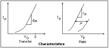 The important variables are the independent variables Vp and Vg, the plate and grid voltages (with respect to the cathode), and the dependent variable Ip, the plate current. A plot of Ip against Vp for a fixed value of Vg is called a plate characteristic, and a plot of Ib against Vg for a fixed value of Vp is called a transfer characteristic. From a family of either characteristics, the complete circuit behavior of the tube can be predicted. Unlike transistors, tubes of different types can have quite different (though similar) characteristics, so characteristic curves are much more important.