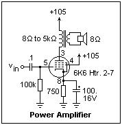 If you plot the plate characteristics of the 6K6 for a screen voltage of 105, the quiescent point can be plotted, and a load line for 5k through it. Using the oscilloscope, find the maximum and minimum plate voltages for a certain input voltage. The average output power is the square of the voltage swing divided by 8 times the load resistance (the factor of 8 converts peak-to-peak to rms). The actual load line was closer to 6k, and the gain was -10. From the plate characteristics, a transconductance of 1.8 mS was measured at 9 mA plate current, so everything hangs together quite well. This circuit is nowhere near the maximum capability of the 6K6, but works very well. It should be driven by a voltage source of about 7 V amplitude for maximum output, which sounds quite loud.