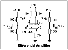 The circuit at the right takes advantage of the 6J6's common cathode. It is a differential amplifier, such as we have seen using transistors. It would have better gain at a plate voltage of 250 V or so, but still works acceptably at the low plate voltage of 150 V. The feature of this circuit is the feedback through the large, unbypassed cathode resistor. This gives the circuit good differential gain but low common-mode gain. The differential input voltage is v2 - v1, while the common-mode input voltage is (v1 + v2/2. Both gains are easily measured with the oscilloscope. I found GD = 6.5 (at one plate), and GCM = 0.15, for a CMRR of 43 or 33 dB. The cathode voltage was 102 V, the total cathode current 3.2 mA. The circuit is probably not optimum, but demonstrates the circuit well, which is also called a "long-tailed pair." With a higher plate voltage, the differential gain could be brought closer to 25.